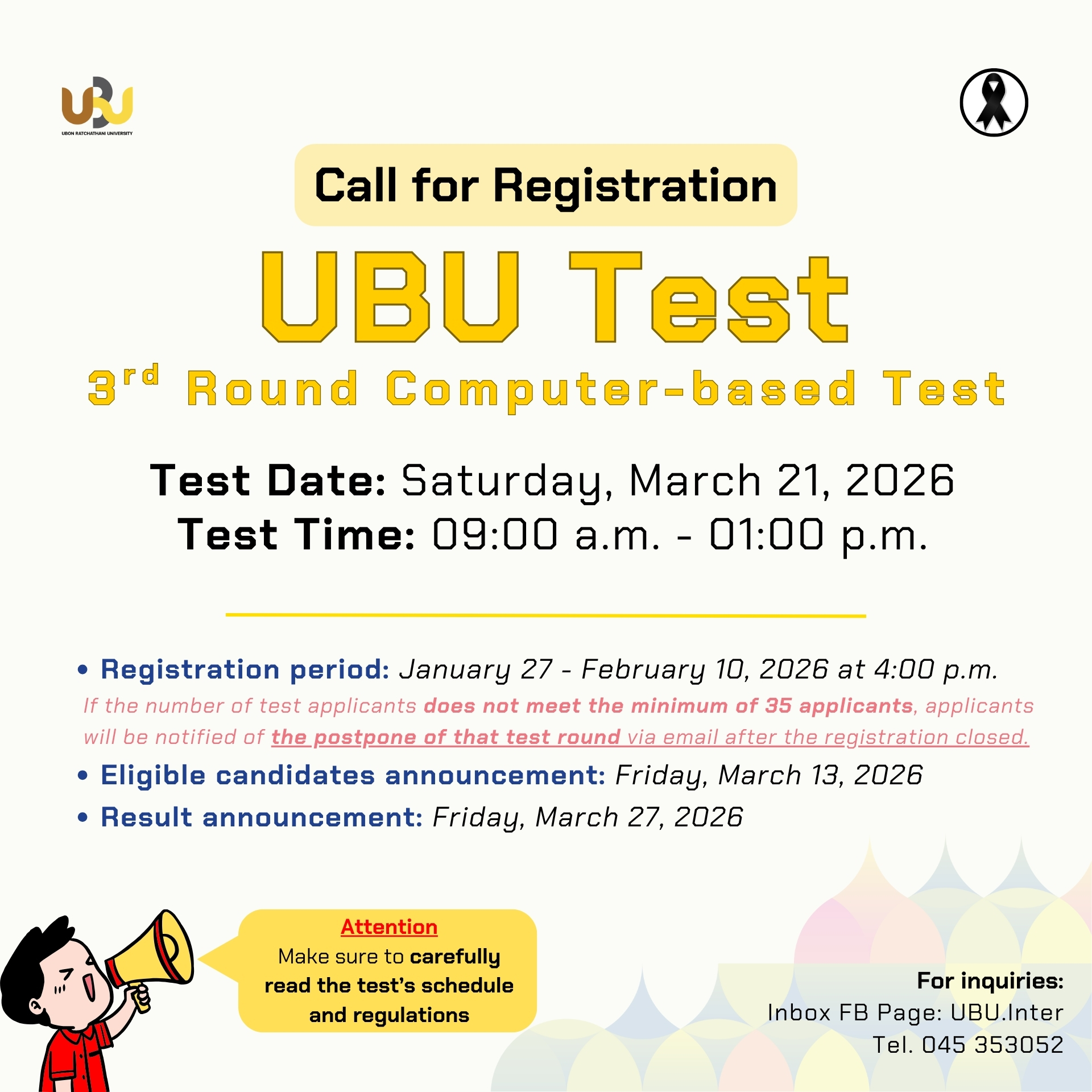 2. ประกาศรายชื่อผู้มีสิทธิ์สอบ: วันศุกร์ที่ 13 มีนาคม 2569 ทาง FB page: UBU.Inter