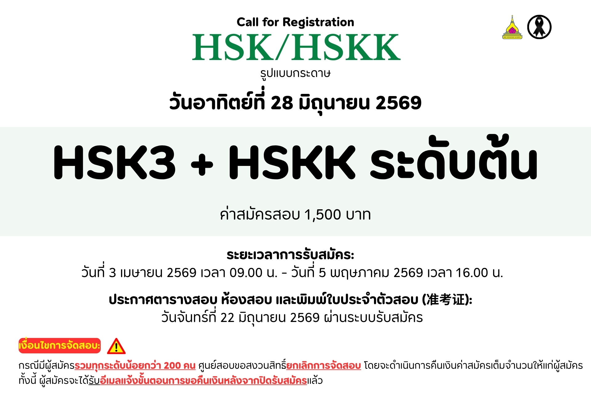 HSK3 + HSKK ระดับต้น ค่าธรรมเนียม 1,500 บาท