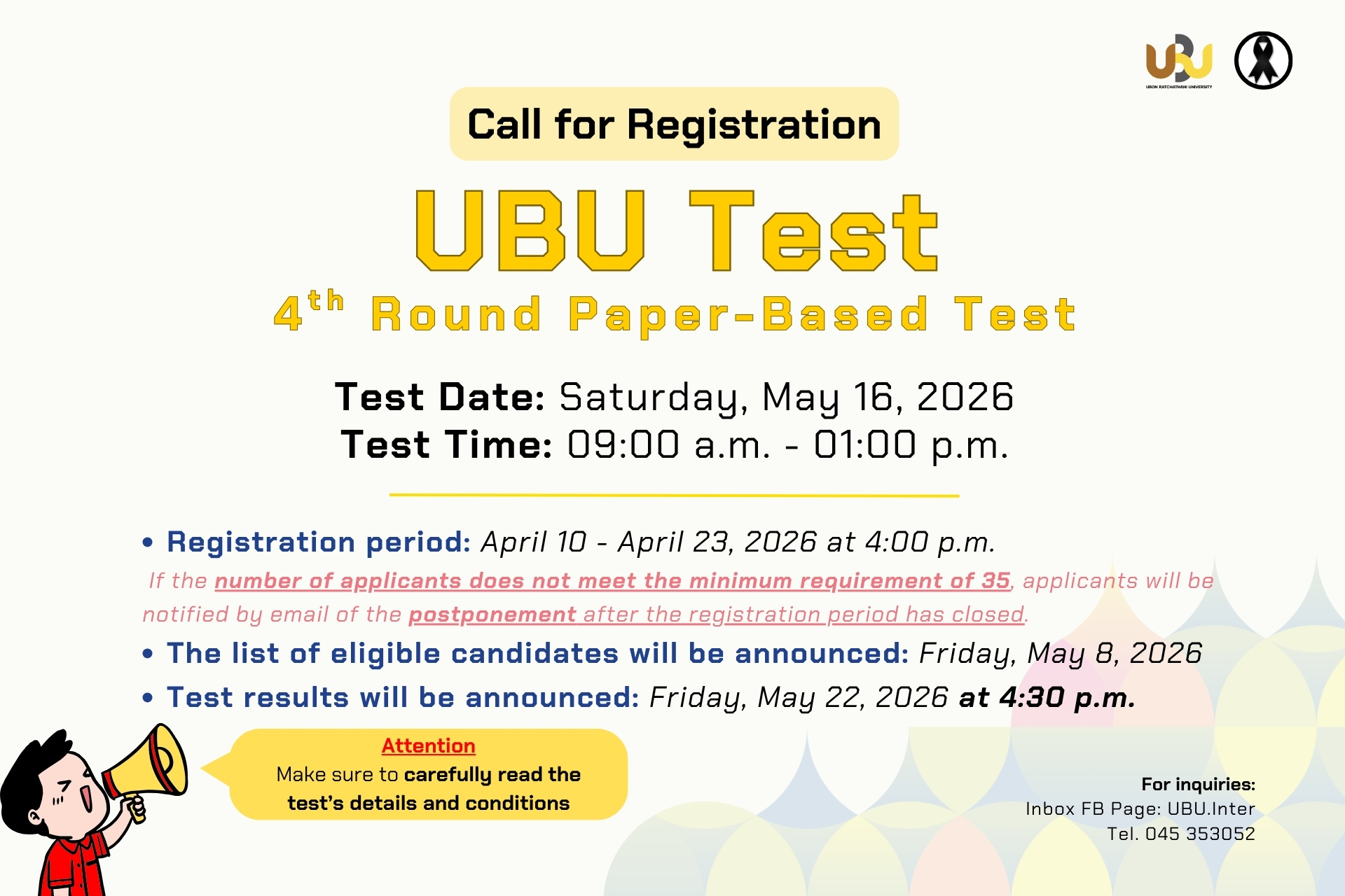 2. ประกาศรายชื่อผู้มีสิทธิ์สอบ: วันศุกร์ที่ 8 เมษายน 2569 ทาง หน้าเว็บรับสมัคร และ FB page: UBU.Inter