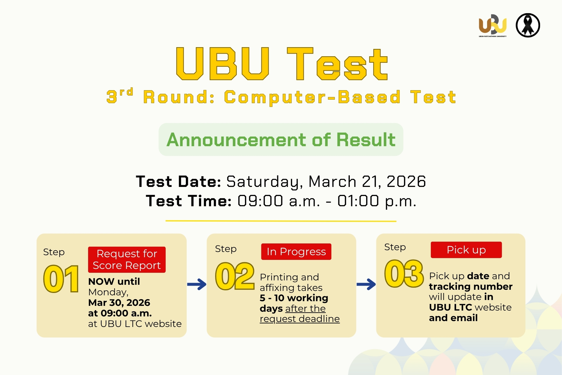 The schedule for in-person collection and the postal tracking number (for those who choose delivery by post) can be checked via the UBULTC system after the Score Reports have been printed.